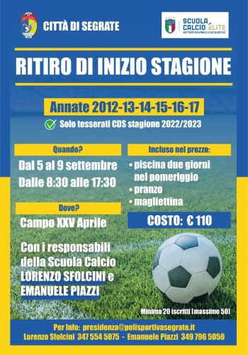 La POL.D. Citta' di Segrate comunica di aver aperto le iscrizioni per il ritiro di inizio attività riservato a tutti i nostri atleti regolarmente tesserati per la stagione 2022-2023